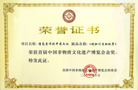 潘高壽傳統(tǒng)中藥文化,作為國家級非物質(zhì)文化遺產(chǎn)項目,代表廣東參加了首屆中國非物質(zhì)文化遺產(chǎn)博覽會。本屆博覽會是我國首次舉辦的非物質(zhì)文化遺產(chǎn)綜合性展會,是全國非遺領(lǐng)域的一件盛事,是一屆圓滿成功、主題鮮明、內(nèi)容精彩、探索創(chuàng)新的博覽會。博覽會的“展品獎”分金獎、銀獎和銅獎。潘高壽“蛇膽川貝枇杷膏”、北京雕漆技藝“剔紅聽濤圖”中堂掛屏等37件作品榮獲金獎,山東魯繡發(fā)絲繡“鵲華秋色”、新疆維吾爾族樂器制作技藝“卡龍”等84件作品榮獲銀獎,西藏藏香制作技藝“直貢藏香”等69件作品榮獲銅獎。