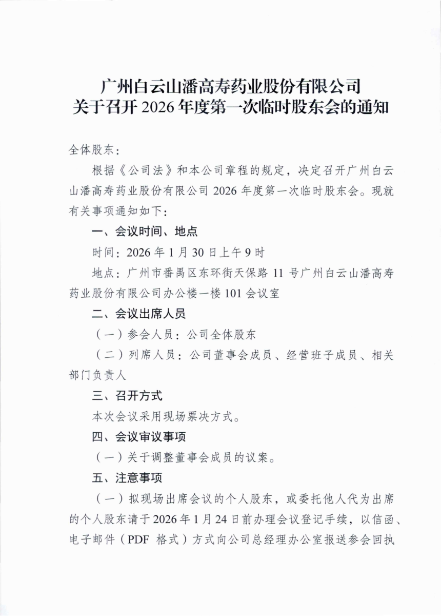 廣州白云山潘高壽藥業股份有限公司關于召開2026年度第一次臨時股東會的通知